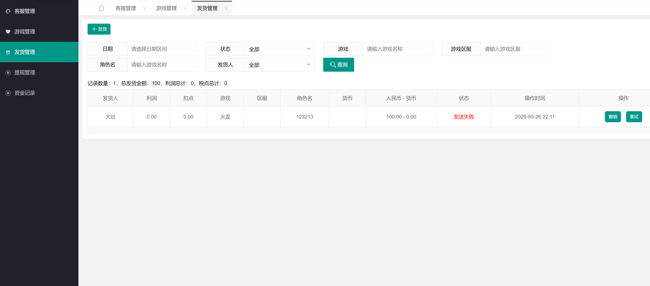 主播登录自己账户,给玩家充值,所有的记录每笔交易都在这里
